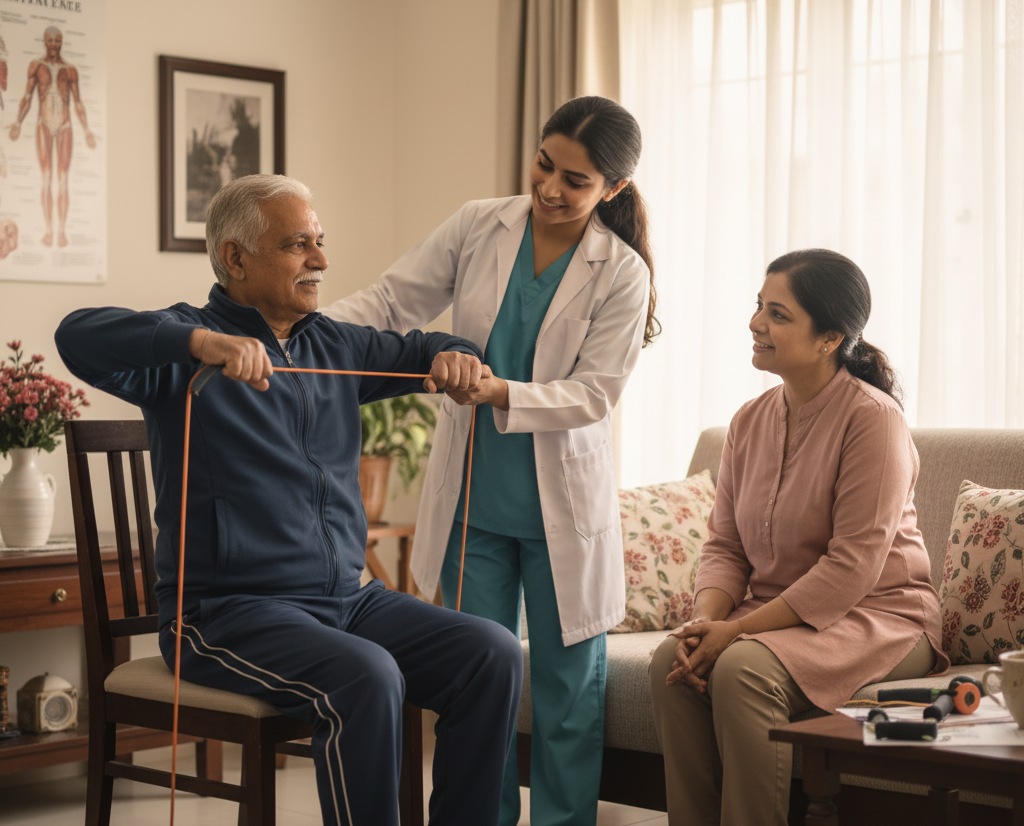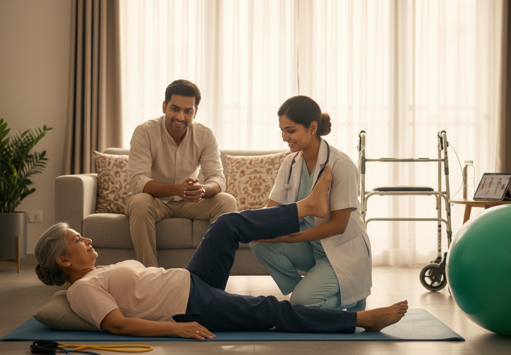 Physiotherapy at home is a personalized rehabilitation service where a licensed physiotherapist visits the patient's home to provide therapeutic exercises, pain relief techniques, mobility training, and recovery support.